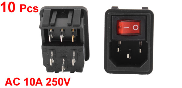 10 Pcs 3 Pin SPST Red Light Rocker Switch IEC320 C14 Power Socket AC 10A 250V