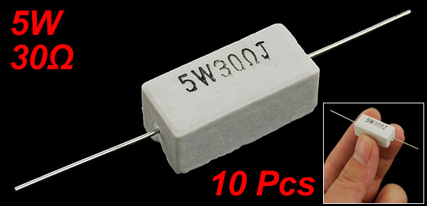 Details10 Pcs 30 Ohm 5W Watt Axial Lead Fixed Cement Resistor  Product Name Cement Resistor Body Material Ceramic, Cement Power 5W Resistance 30Ω Tolerance ±5% Body Size (Approx.) 22 x 10 x 9mm/ 0.87" x 0.39" x 0.35" (L*W*H) Lead Diameter (Approx.) 0.8mm/ 0.031" Lead Length (Approx.) 21mm/ 0.83"(Max.), 18mm/ 0.7" (Min.) Color White Weight 44g Package Content 10 x Cement Resistors