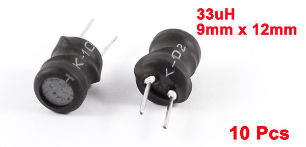 Product Name Inductor Material UL-polyolefin, Metal Inductance 33uH Body Size 9 x 12mm / 0.35" x 0.47"(D*H) Lead Distance 4mm / 0.157" Color Black, Silver Tone Weight 37g Package Content 10 x Inductors - Reviews