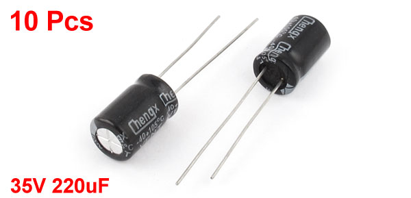 Product Name Electrolytic Capacitor Type Radial Lead Temperature -40 to +105C Voltage Rated 35V Capacitance 220uF Tolerance +/-20% Body Size 8 x 12mm / 0.31"x 0.5" (D*L) Lead Dia 0.6mm/0.02" Dielectric Material Aluminum Weight 11g Color Black Package Content 10 Pcs x Electrolytic Capacitor - Reviews