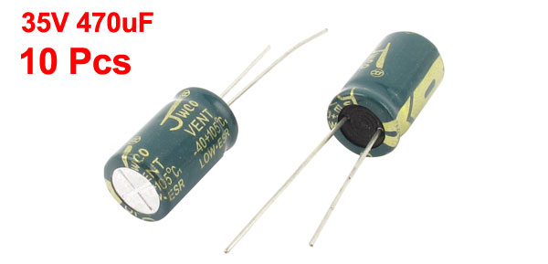 Product Name Electrolytic Capacitor Type Radial Lead Temperature -40 to +105C Voltage Rated 35V Capacitance 470uF Tolerance +/-20% Body Size 10 x 17mm / 0.4"x 0.7" (D*L) Lead Dia 0.6mm/0.02" Dielectric Material Aluminum Weight 22g Color Green Package Content 10 Pcs x Electrolytic Capacitor - Reviews