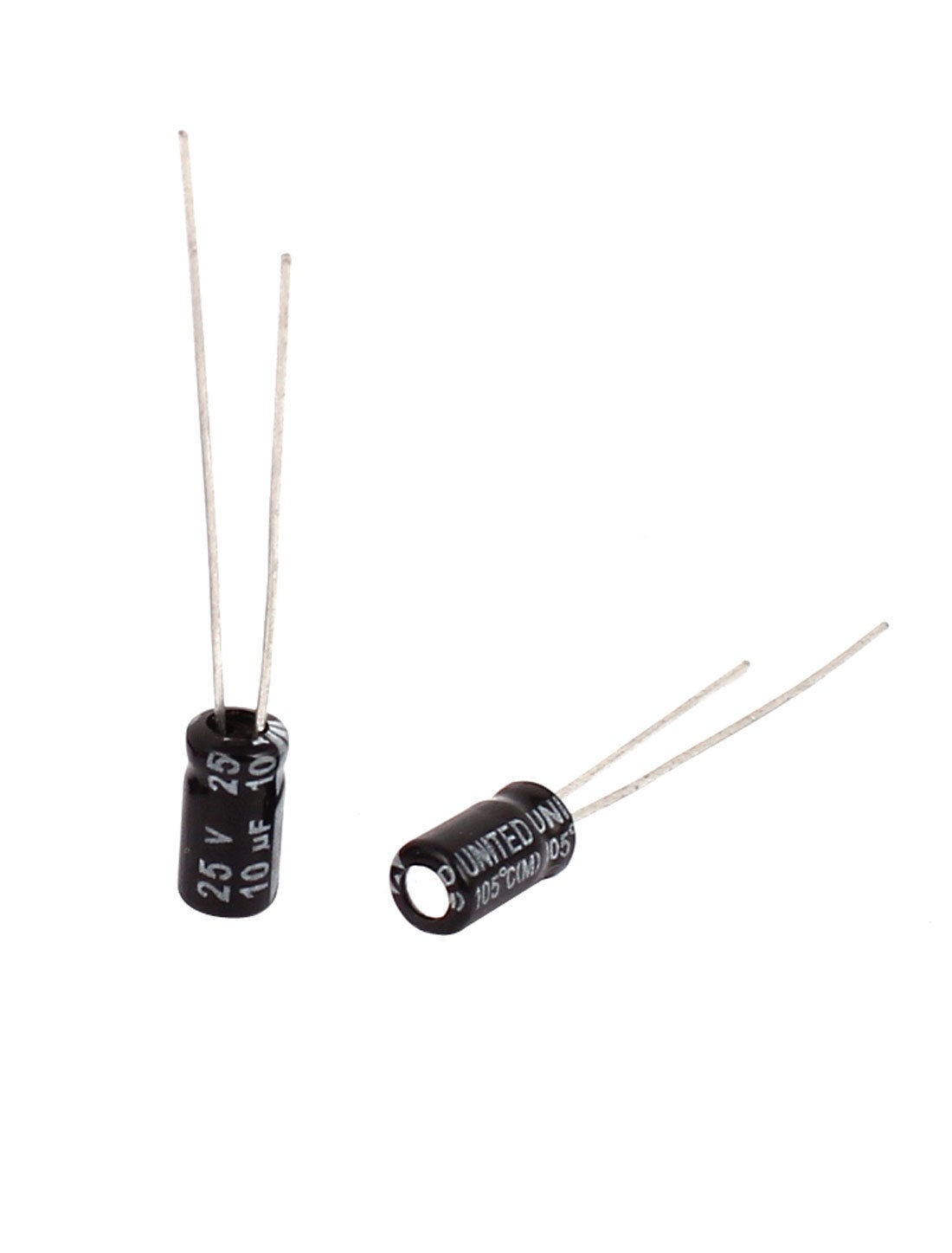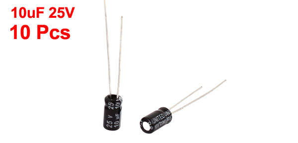 Product Name Electrolytic Capacitor Type Radial Lead Maximum Temperature -40+105°C Withstand Voltage 25V Capacitance 10UF Body Size 4 x 7mm / 0.2" x 0.3" (D*L) Lead Length 20mm/ 0.8", 26mm/ 1" Total Length 33mm/ 1.3" Dielectric Material Aluminum Weight 4g Color Black, Gray Package Content 10 Pcs x Electrolytic Capacitors - Reviews