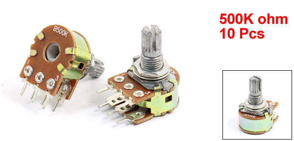 Product Name Potentiometer Resistance Value 500K ohm Power AC 250V Adjustment Type Adjustment Top Type Dual Linear(Type B) Features Knurled Shaft Shaft Diameter 6mm / 0.2" Shaft Length 8mm / 0.31" Mounting Thread Diameter 6.6mm / 0.26" Base Size 16 x10mm / 0.63" x 0.39"(D*H) Total Height 27mm/1.06" Material Metal, Electronic Parts,Carbon Film Net Weight 72g Package 10 x Potentiometer - Reviews