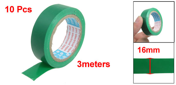 Product Name Electrical Insulation Tape Tape Width 16mm/ 0.6" Tape Thickness 6mm/ 0.2" Tape Length 3meters/ 118"/ 9.8 Ft Overall Diameter 55mm/ 2.2" Material PVC Color Green Weight 258g Package Content 10 x Adhesive Insulation Tape Roll - Reviews