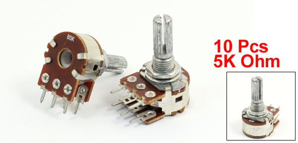 Details10 Pcs 5K Ohm Knurled Shaft Adjust Double Linear Potentiometers AC 250V  Product Name Potentiometer Resistance Value 5K ohm Power AC 250V Adjustment Type Adjustment Top Type Dual Linear(Type B) Features Knurled Shaft Shaft Diameter 5mm / 0.2" Shaft Length 20mm / 0.78" Mounting Thread Diameter 6.8mm / 0.26" Base Size 16 x10mm / 0.63" x 0.39"(D*H) Total Height 31mm/1.22" Material Metal, Electronic Parts,Carbon Film Net Weight 84g Package 10 x Potentiometer