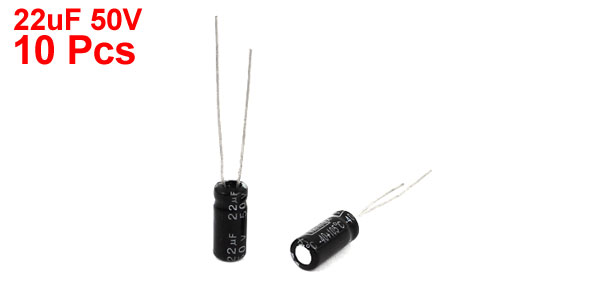 Product Name Electrolytic Capacitor Type Radial Lead Maximum Temperature -40+105°C Withstand Voltage 50V Capacitance 22UF Body Size 5 x 12mm / 0.2" x 0.58" (D*L) Lead Length 21mm/ 0.8",26mm/ 1" Total Length 38mm/ 1.5" Dielectric Material Aluminum Weight 5g Color Black, Gray Package Content 10Pcs x Electrolytic Capacitors - Reviews