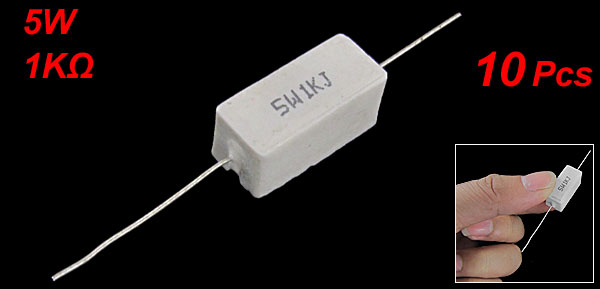 Product Name Cement Resistor Body Material Ceramic, Cement Power 5W Resistance 1KΩ Tolerance ±5% Body Size (Approx.) 22 x 10 x 9mm/ 0.87" x 0.39" x 0.35" (L*W*H) Lead Diameter (Approx.) 0.8mm/ 0.031" Lead Length (Approx.) 26mm/ 1.02"(Max.), 21mm/ 0.83" (Min.) Color White Weight 45g Package Content 10 x Cement Resistors - Reviews