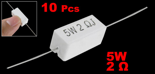 Details10 Pcs 5W Watt 2 Ohm 5% Wire Wound Ceramic Cement Resistors  Product Name Cement Resistor Body Material Ceramic, Cement Power 5W Resistance 2Ω Tolerance ±5% (J) Body Size (Approx.) 22 x 9 x 9mm/0.86" x 0.35" x 0.35" (L * W * H) Lead Diameter(Approx.) 0.8mm/0.031" Color White Weight 44g Package Content 10 x Cement Resistors