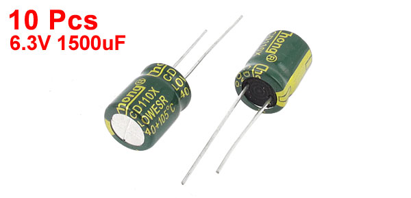 Product Name Electrolytic Capacitor Type Radial Lead Temperature -40 to +105C Voltage Rated 6.3V Capacitance 1500uF Tolerance +/-20% Body Size 10 x 13mm / 0.4"x 0.5" (D*L) Lead Dia 0.6mm/0.02" Dielectric Material Aluminum Weight 16g Color Green Package Content 10 Pcs x Electrolytic Capacitor - Reviews