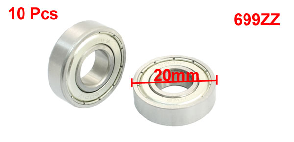 Details10 Pcs 699ZZ 9mm x 20mm x 6mm One Row Sealed Deep Groove Ball Bearings  Product Name Deep Groove Ball Bearing Model No. 699ZZ Inner Diameter 9mm / 0.35" Outer Diameter 20mm / 0.8" Height 6mm / 0.24" Color Silver Tone Material Metal Net Weight 78g Package Content 10 Pcs x Deep Groove Ball Bearings