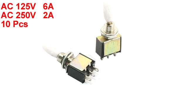Details10 Pcs 6A 125VAC 2A 250VAC SPDT 2-Positions Toggle Switches  Product Name Toggle Switch Model KNX-1X2 Power 6A 125V AC 2A 250VAC Position 2 Position Pins 3 Type SPDT Size 13 x 10 x 36mm / 0.51" x 0.4" x 1.4" (L*W*H) Main Color Black & Silver Tone Total Weight 43g Package Content 10 x Toggle Switch
