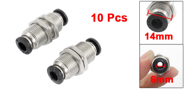 Product Name Quick Fittings Model JPM-6 Medium Air & Water Material Plastic, Metal Thread Diameter (Approx.) 14mm Inner Diameter (Black End) 6mm Total Dimension (Approx. ) 35.8 x 219.4mm / 1.4" x 0.8"(L*D) Color Silver Tone, Black Weight 238g Package Content 10 x Quick Fittings - Reviews