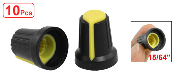 Product Name Potentiometer Control Knob Knob Top Diameter 10mm / 0.39" Knob Base Diameter 14.5mm / 0.57" Shaft Insert Diameter 6mm / 15/64" Knob Total Height 17.5mm / 0.69" Material Plastic Main Color Black, Yellow Weight 11g Package Included 10 x Potentiometer Control Knob - Reviews