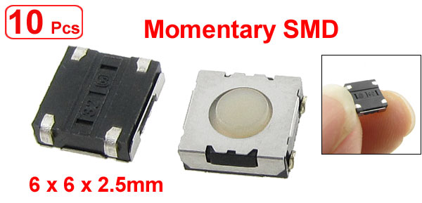 Product Name Tact Switch Contact Type Momentary Contact Mounting Type SMD Dimension 6 x 6 x 2.5mm / 0.24" x 0.24" x 0.1" (L*W*H) Button Dia. 3mm / 0.12" Material Plastic, Metal, Electric Parts Color Black, Silver Tone, Clear Net Weight 3g Package Content 10 x Tact Switches - Reviews
