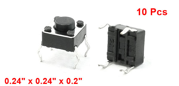 Product Name Tact Switch Action Type Momentary Total Size(Pin No Include) 6 x 6 x 4.3mm/0.24" x 0.24" x 0.2"(L*W*T) Button Diameter 3mm/0.1" Material Plastic, Metal Color Black Net Weight 2g Package Content 10 x Tact Switches - Reviews