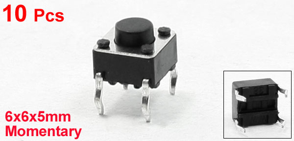 Product Name Tact Switch Action Type Momentary Total Size(Pin No Include) 6 x 6 x 5mm/0.24" x 0.24" x 0.2"(L*W*T) Button Diameter 3mm/0.1" Material Plastic, Metal Color Black Net Weight 2g Package Content 10 x Tact Switches - Reviews