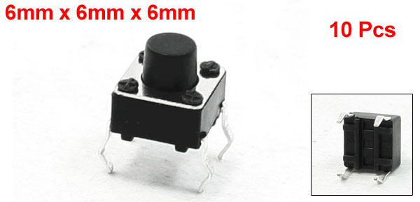 Product Name Tact Switch Action Type Momentary Total Size(Pin No Include) 6 x 6 x 6mm/0.24" x 0.24" x 0.24"(L*W*T) Button Diameter 3mm/0.1" Material Plastic, Metal Color Black Net Weight 2g Package Content 10 x Tact Switches - Reviews