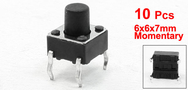 Product Name Tact Switch Action Type Momentary Total Size(Pin No Include) 6 x 6 x 7mm/0.24" x 0.24" x 0.3"(L*W*T) Button Diameter 3mm/0.1" Material Plastic, Metal Color Black Net Weight 3g Package Content 10 x Tact Switches - Reviews