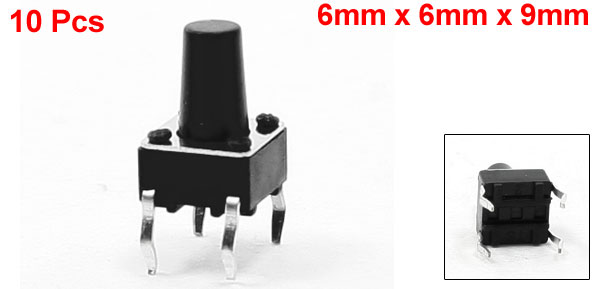 Product Name Tact Switch Action Type Momentary Total Size(Pin No Include) 6 x 6 x 9mm/0.24" x 0.24" x 0.35"(L*W*T) Button Diameter 3mm/0.1" Material Plastic, Metal Color Black Net Weight 3g Package Content 10 x Tact Switches - Reviews
