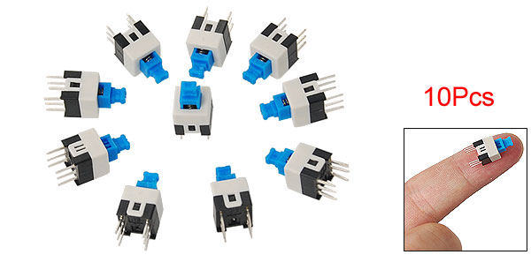 Product Name Tactile Push Switch Contace Resistance <0.3mΩ Insulation Resistance >100mΩ Operation Force 150-300g/ Rating DC 0.5A 30V Withstand Voltage AC 250V (50Hz))/min Life 100, 000 cycles Operation Temperature -40oC to 70oC Square Body Type 7 x 7mm Operating Mode Self Lock with Click Two Row Pin Size 5 x 4mm(L*W) Pin Length 3mm Knob Size 3.4 x 3.4mm(L*W) Cap Size 2.6 x 1.8mm(L*W) Color Black, Blue Material(External) Plastic, Metal Weight 5g Package Content 10 x Self-Lock Tactile Switch - Reviews