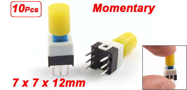 Button Cap Size 6 x 7mm / 0.2" x 0.27"(D*H) Pin Pitch 5.5 x 2.5mm / 0.2" x 0.098" (L*W) Pin Length 3mm / 0.12" Material Plastic, Metal, Electric Parts Color Black, White, Yellow Net Weight 7g Package Content 10 x Tactile Push Switch w Cap - Reviews