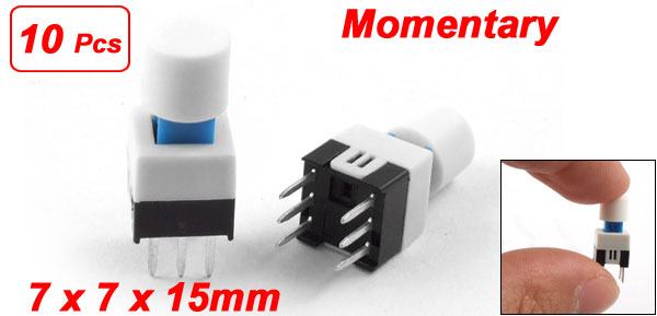 Product Name Tact Switch Action Type Momentary Switch Size 7 x 7 x 15mm / 0.27" x 0.27" x 0.59" (L*W*H) Button Size 8 x 5 mm/ 0.31" x 0.19" (H*D) Pin Spacing Long:4.6mm/ 0.18"