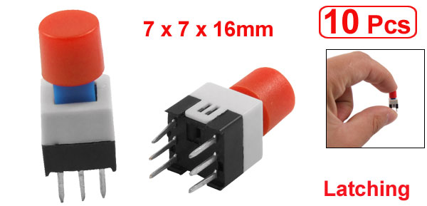 Product Name Tact Switch Contact Type Latching Dimension 7 x 7 x 16mm / 0.27" x 0.27" x 0.63" (L*W*H) Button Cap Size 6 x 5mm / 0.23" x 0.2"(D*H) Pin Pitch 5 x 2mm / 0.2" x 0.08" (L*W) Pin Length 4mm / 0.16" Material Plastic, Metal, Electric Parts Color Black, White, Red, Blue Net Weight 6g Package Content 10 x Tact Switch w Cap - Reviews