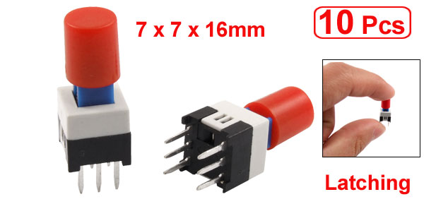 Product Name Tactile Switch Contact Type Latching Dimension 7 x 7 x 16mm / 0.27" x 0.27" x 0.63" (L*W*H) Button Cap Size 6 x 7mm / 0.23" x 0.27"(D*H) Pin Pitch 5 x 2.5mm / 0.2" x 0.1"(L*W) Pin Length 4mm / 0.16" Material Plastic, Metal, Electric Parts Color Black, White, Blue, Red Net Weight 7g Package Content 10 x Tactile Push Switch w Cap - Reviews