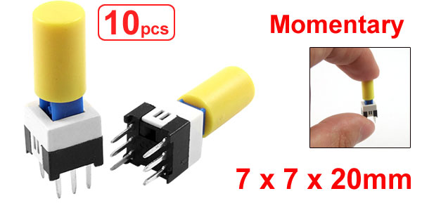 Product Name Tact Switch Contact Type Momentary Dimension 7 x 7 x 20mm / 0.27" x 0.27" x 0.8" (L*W*H) Button Cap Size 6 x 10mm / 0.24" x 0.39"(D*H) Pin Pitch 5 x 2mm / 0.2" x 0.08" (L*W) Pin Length 4mm / 0.16" Material Plastic, Metal, Electric Parts Color Yellow, Blue, Black, White Net Weight 7g Package Content 10 x Tact Switch - Reviews