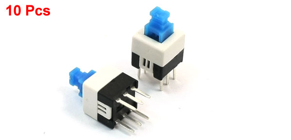 Details10 Pcs 7mm x 7mm Self Lock Push Button Tactile Tact Switch 6 Pin  Product Name Tactile Switch Action Type Latching DPDT Type 7 x 7mm Two Row Pin Distance 5mm Color Black, Blue Material(External) Plastic, Metal Weight 7g Package Content 10 x Tactile Switch