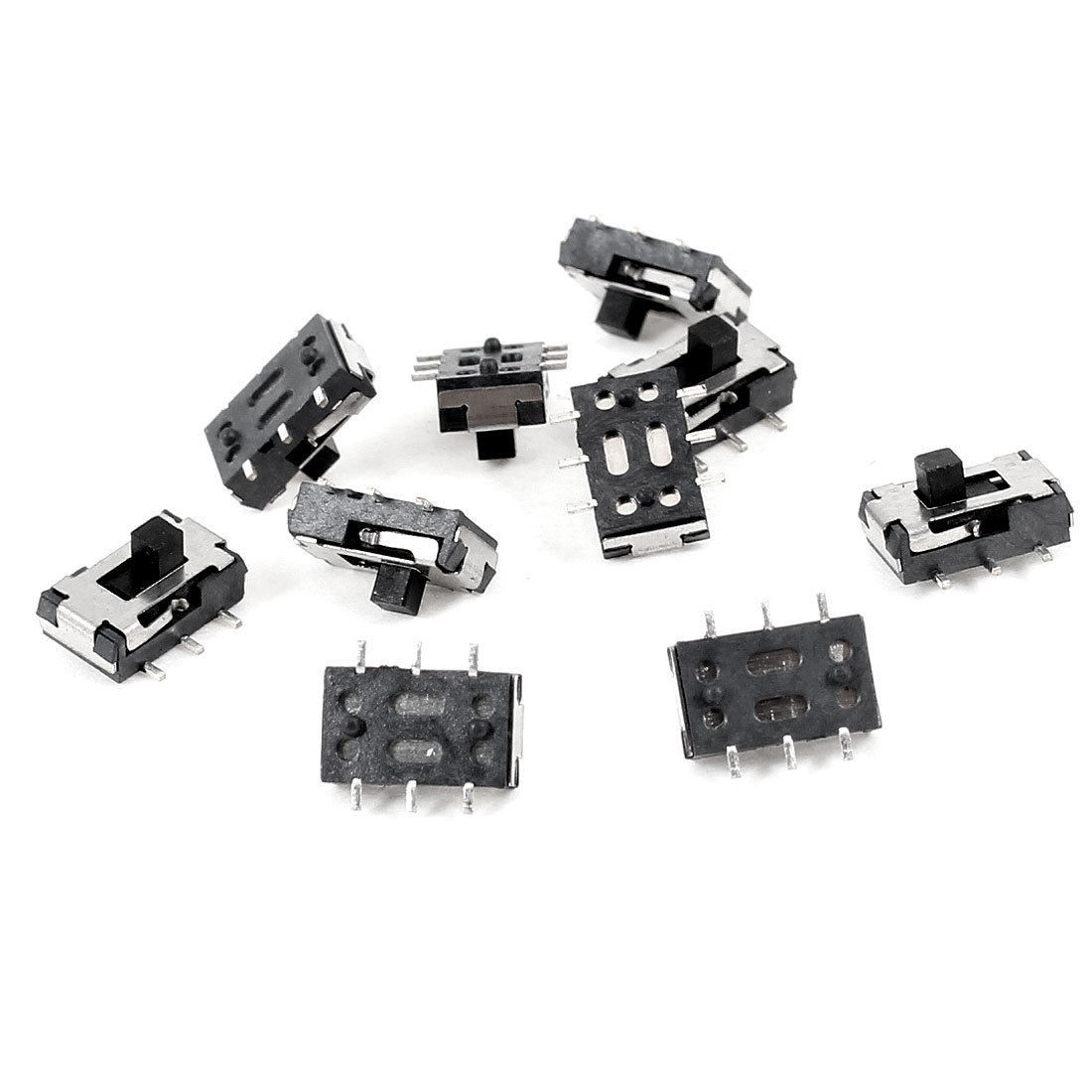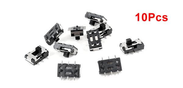 Product Name Slide Switch Position 3 Pins Design 6 Pin(SMD SMT) Contact Type On/Off/On (DPDT) Body Size 7 x 4 x 2mm/ 0.3" x 0.16" x 0.08" (L*W*H) Pin Spacing 1.6mm/0.06" Material Plastic, Metal Color Black, Silver Tone Weight 2g Package 10 x Slide Switch - Reviews