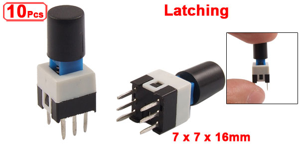Product Name Tact Switch Contact Type Latching Dimension 7 x 7 x 16mm / 0.27" x 0.27" x 0.63" (L*W*H) Button Cap Size 6 x 7mm / 0.23" x 0.27"(D*H) Pin Pitch 5 x 2mm / 0.2" x 0.08" (L*W) Pin Length 4mm / 0.16" Material Plastic, Metal, Electric Parts Color Black, Blue, Gray Net Weight 7g Package Content 10 x Tact Switch w Cap - Reviews