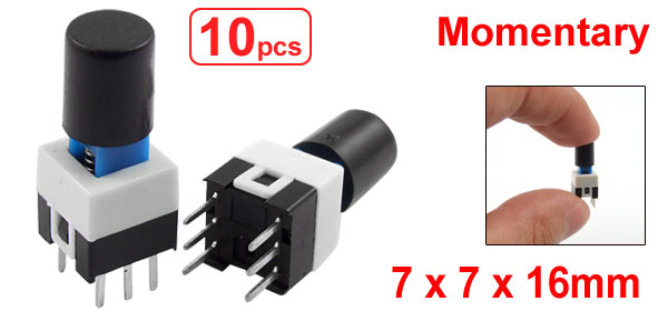 Product Name Tactile Switch Contact Type Momentary Dimension 7 x 7 x 16mm / 0.27" x 0.27" x 0.63" (L*W*H) Button Cap Size 6 x 7mm / 0.23" x 0.27"(D*H) Pin Pitch 5 x 2.5mm / 0.2" x 0.1"(L*W) Pin Length 4mm / 0.16" Material Plastic, Metal, Electric Parts Color Black, White, Blue Net Weight 6g Package Content 10 x Tactile Push Switch w Cap - Reviews