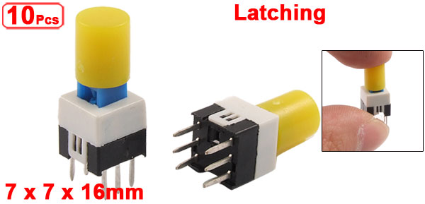 Product Name Tact Switch Contact Type Latching Dimension 7 x 7 x 16mm / 0.27" x 0.27" x 0.63" (L*W*H) Button Cap Size 6 x 7mm / 0.23" x 0.27"(D*H) Pin Pitch 5 x 2mm / 0.2" x 0.08" (L*W) Pin Length 4mm / 0.16" Material Plastic, Metal, Electric Parts Color Black, Blue, White, Yellow Net Weight 7g Package Content 10 x Tact Switch w Cap - Reviews