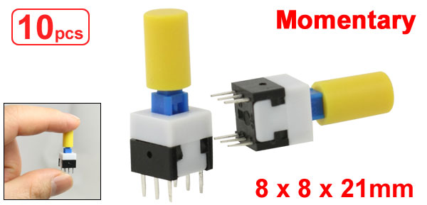 Product Name Tact Switch Contact Type Momentary Contact Dimension 8 x 8 x 21mm / 0.31" x 0.31" x 0.83" (L*W*H) Button Dia. 6mm / 0.24" Pin Pitch 6 x 2mm / 0.24" x 0.08" (L*W) Pin Length 4mm / 0.16" Material Plastic, Metal, Electric Parts Color Yellow, Blue, Black, White Net Weight 9g Package Content 10 x Tact Switches - Reviews