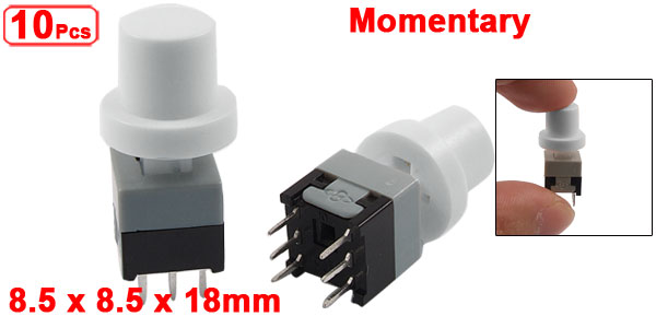 Product Name Tact Switch Contact Type Momentary Dimension 8.5 x 8.5 x 18mm / 0.33" x 0.33" x 0.71" (L*W*H) Button Cap Size 7.5 x 10mm / 0.69" x 0.39"(Top.D*H) Pin Pitch 5 x 2.5mm / 0.2" x 0.1" (L*W) Pin Length 3.5mm / 0.14" Material Plastic, Metal, Electric Parts Color Black, Gray, White Net Weight 12g Package Content 10 x Tact Switch w Cap - Reviews