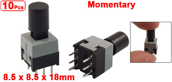Product Name Tact Switch Contact Type Momentary Dimension 8.5 x 8.5 x 18mm / 0.33" x 0.33" x 0.71" (L*W*H) Button Cap Size 6 x 7mm / 0.23" x 0.27"(D*H) Pin Pitch 5.5 x 2.5mm / 0.22" x 0.1" (L*W) Pin Length 4mm / 0.16" Material Plastic, Metal, Electric Parts Color Black, Gray Net Weight 9g Package Content 10 x Tact Switch w Cap - Reviews