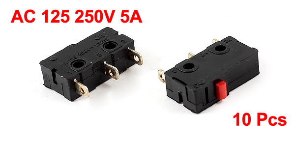 Product Name Micro Switch Voltage & Current AC 125 250V 5A Contact Type SPDT 1NO 1NC 1COM Action Type Momentary Actuator Type Red Push Button Terminal Type 3 Pins Overall Size(Pin not included) 20 x 9.7 x 6.6mm / 0.8" x 0.4" x 0.3" (L*W*H) Mounting Hole Dia. 2.5mm / 0.08" Mounting Hole Spacing 7mm/ 0.35" Material Plastic, Metal Color Black, Red, Silver Tone Net Weight 22g Package Content 10 x Micro Switch - Reviews