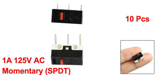 Product Name Micro Switch Voltage & Current AC 125V 1A Poles SPDT Contact Type 1NO + 1NC Action Type Momentary Actuator Type Push Button Terminal Type 3-Pin Right Angle Terminals Overall Size(Pin not included) 13 x 6 x 6mm / 0.5" x 0.2" x 0.2" (L*W*H) Mounting Hole Dia. 2mm / 0.08" Mounting Hole Spacing 6mm/ 0.2" Pin Size 6 x 1mm/ 0.2" x 0.04"(L*W) Push Button Size 3 x 1mm / 0.1" x 0.04" (L*W ) Material Plastic, Metal Color Black, White Total Weight 7g Package Content 10 x Micro Switches - Reviews