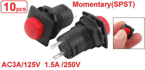 Product Name SPST Push Button Switch Action Type Momentary Contact Type NO Rating Voltage AC 3A / 125V; 1.5A / 250V Terminals Quanlity 2 Pins Mounting Hole Diameter 12.2mm / 0.48" Button Size 9 x 9mm / 0.35" x 0.35"(L * W) Terminals Pitch 5.8mm / 0.228" Overall Size 15 x 15 x 30mm / 0.59" x 0.59" x 1.18"(L*W*H) Material Plastic & Metal Color Red & Black Weight 29g Package Content 10 x SPST Push Button Switch - Reviews