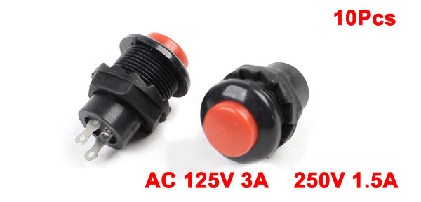 Item Name Push Button Switch Contact Type SPST Action Type Self-locking Working Voltage AC 125V 3A, 250V 1.5A Terminals 2 Mounting Thread Diameter 13mm / 0.5" Button Diameter 9mm / 0.4" Total Size 15 x 30mm/0.6" x 1.2"(D*H) Color Red, Black Material Plastic, Electronic Parts Weight 22g Package Content 10 x Push Button Switch - Reviews