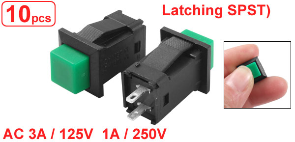 Product Name SPST Push Button Switch Action Type Latching Contact Type NO Rating Voltage AC 3A / 125V; 1A / 250V Terminals Quanlity 2 Pins Button Size 9 x 9mm / 0.35" x 0.35"(L * W) Mounting Hole Size 12.4 x 10.6mm / 0.488" x 0.417"(L * W) Terminals Pitch 5.2mm / 0.205" Overall Size 14 x 14 x 29mm / 0.55" x 0.55" x 1.14"(L*W*H) Material Plastic & Metal Color Green & Black Weight 30g Package Content 10 x SPST Push Button Switch - Reviews