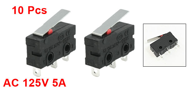 Product Name Micro Switch Voltage & Current AC 125V 5A Contact Type SPDT 1NO 1NC 1COM Action Type Momentary Actuator Type Short Straight Hinge Lever Terminal Type 3 Pins Overall Size(Pin not included) 20 x 6 x 10mm / 0.8" x 0.2" x 0.4" (L*W*H) Hinge Lever Length 15mm/0.6" Mounting Hole Dia. 2mm / 0.08" Mounting Hole Spacing 9mm/ 0.35" Material Plastic, Metal Color Black, Silver Tone Net Weight 20g Package Content 10 x Micro Switch - Reviews