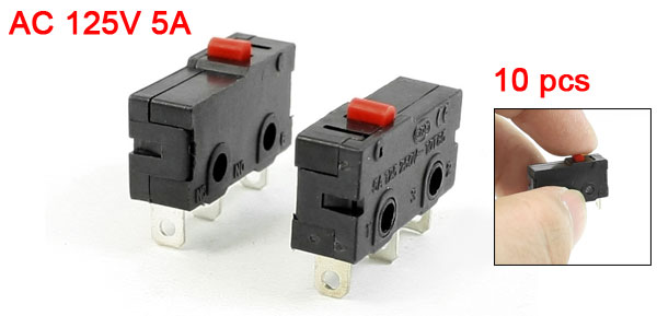 Product Name Micro Switch Voltage & Current AC 125V 5A Contact Type SPDT 1NO 1NC 1COM Action Type Momentary Actuator Type Red Push Button Terminal Type 3 Pins Overall Size(Pin not included) 20 x 6 x 10mm / 0.8" x 0.2" x 0.4" (L*W*H) Mounting Hole Dia. 2mm / 0.08" Mounting Hole Spacing 9mm/ 0.35" Material Plastic, Metal Color Black, Red, Silver Tone Net Weight 18g Package Content 10 x Micro Switch - Reviews