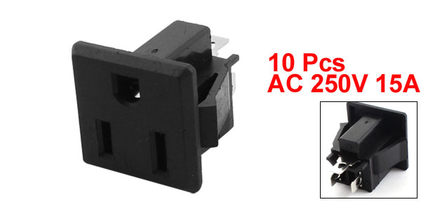 Details10 Pcs AC 250V 15A Square Panel Mount US 3Pin Female Jack Socket Connector Black  Product Name Female Power Socket Material Plastic, Metal Color Black, Silver Tone Power Supply AC 250V 15A Fit for Plug Type US Plug Terminals Quantity 3 Total Size 2.7 x 2.7 x 3.5cm / 1" x 1" x 1.4" (L*W*H) Weight 119g Package Content 10 x Female Power Sockets