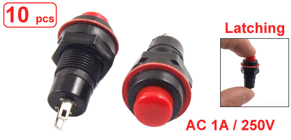 Product Name Push Button Switch Action Type Momentary Contact Type NO Poles SPST Rating Voltage AC 1A / 250V Terminals Quantity 2 Pins Thread Dia. 9.5mm/ 0.37" Button Dia. 8mm / 0.31" Terminals Pitch 3.8mm / 0.15" Overall Size 31 x 14mm / 1.2" x 0.55"(Max. L * D) Material Plastic & Metal Color Red & Black Weight 27g Package Content 10 x Push Button Switch - Reviews