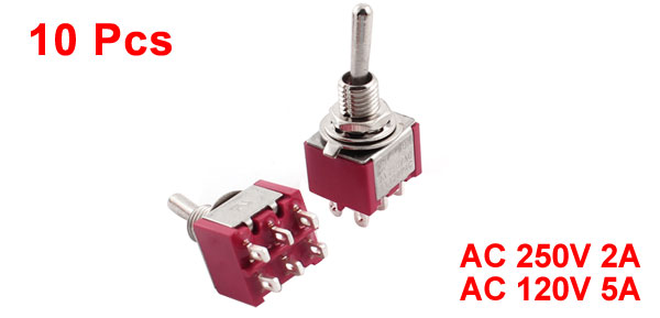 10 Pcs AC 250V/2A 120V/5A DPDT 2 Position 6 Pins Toggle Switch Red