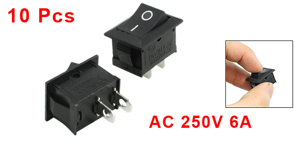 Product Name Rocker Switch Type On Off, SPST Terminals Number 2 Rating Voltage AC 250V 6A Total Size(Each) 30 x 25 x 35cm/ 1.2" x 1" x 1.4"(L*W*H) Mounted Size 31 x 21.6 x 26mm/ 1.22" x 0.85" x 1.02" (L*W*H) Pin Size 8.5 x 5.8mm /0.3" x 0.2"(L*W) Pin Spacing 11mm/ 0.424" Color Black Material Plastic, Metal Total Weight 34g Package Content 5 x Rocker Switches - Reviews