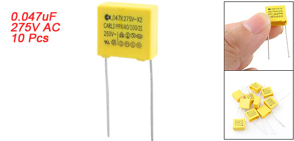 Product Name Safety Capacitor Dielectric Material Polypropylene Model MPX Series X2 Capacitance 0.047uF Tolerance ±10% Rating Voltage 250V AC Withstand Voltage 275V AC Body Size (Approx.) 12.8 x 12 x 5.8mm / 0.503" x 0.472" x 0.228" (L * W * T) Lead Size (Approx.) 0.6 x 13.8mm / 0.023" x 0.543" (D * L) Lead Spacing (Approx.) 12.7mm / 0.5" Color Yellow Weight 14g Package Content 10 x Safety Capacitors - Reviews