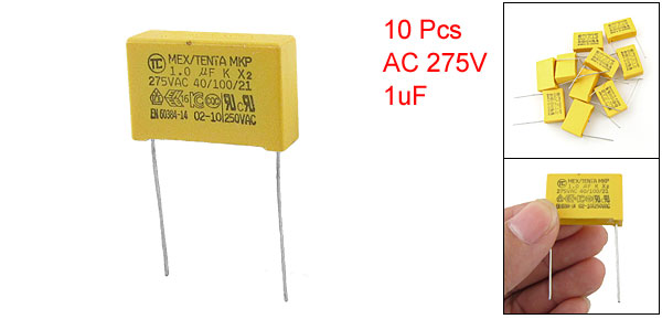 Product Name Safety Capacitor Dielectric Material Polypropylene Model MKP Series X2 Capacitance 1uF Tolerance ±10% Withstand Voltage 275V AC Rating Voltage 250V AC Body Size (Approx.) 26.3 x 16.8 x 8.2mm / 1.03" x 0.66" x 0.32" (L * W * T) Lead Size (Approx.) 0.7 x 26mm / 0.03" x 1.02" (D * L) Lead Spacing (Approx.) 21.7mm / 0.854" Color Yellow Weight 47g Package Content 10 x Safety Capacitors - Reviews